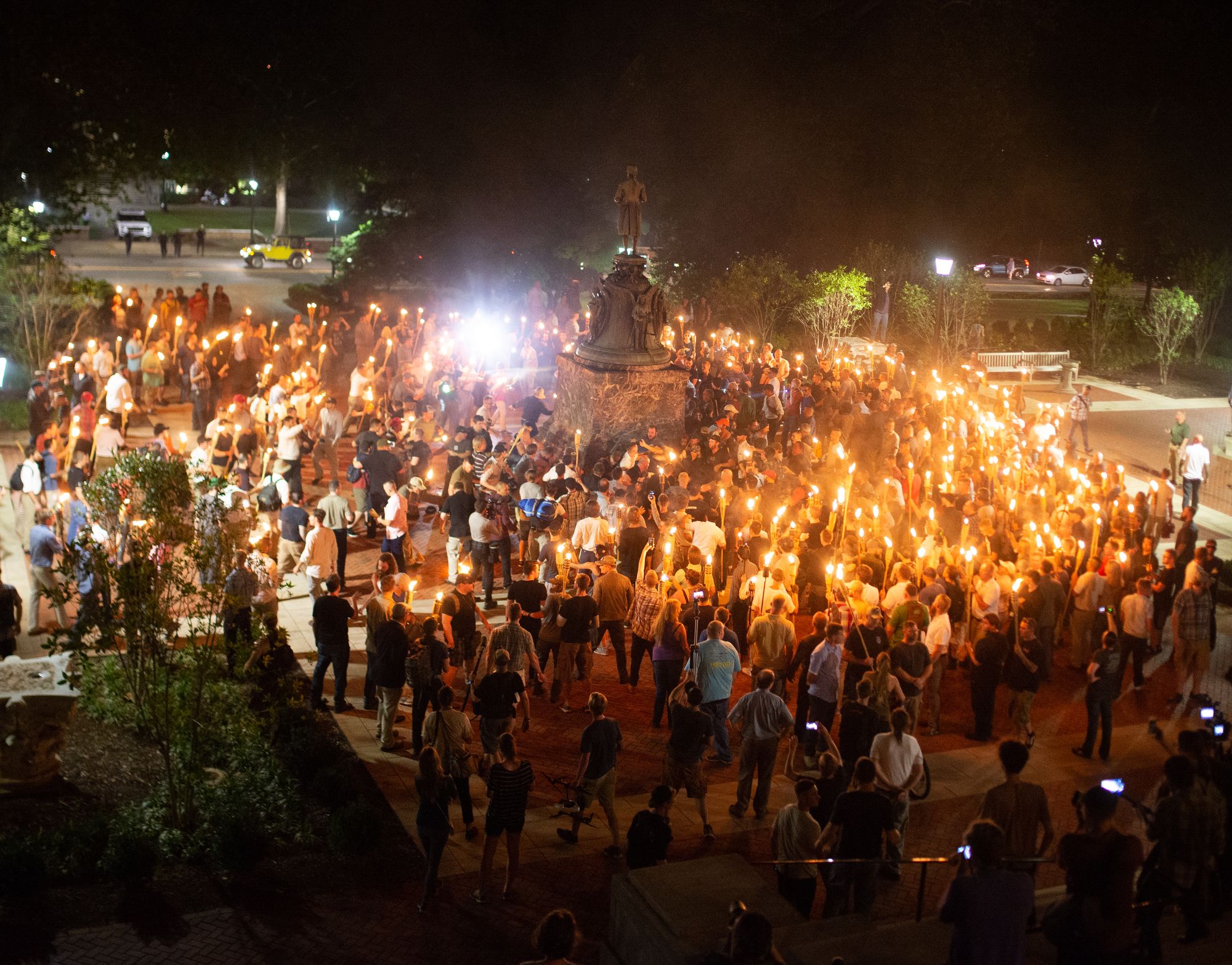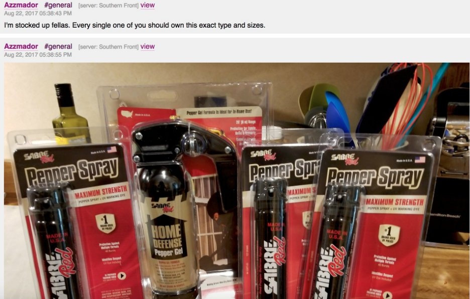 The 'gassing' Azzmador so proudly recounts the morning after the torch march was captured on film. In a wide shot taken by photojournalist Zach D. Roberts from above the crowd, you can play a sort of cursed game of Where's Waldo, but instead of Waldo's recognizable red and white stripes, you're looking for a bearded bigot in a red hat, the stream of his Sabre Red® pepper spray illuminated by a camera flash.