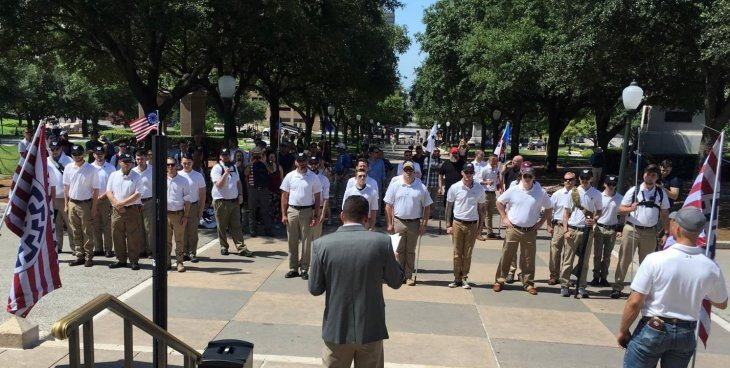A week after his scuffle with the militia in Houston, Azzmador, with his pair of redheaded bodyguards, showed up in Austin where influential alt-right speakers addressed a small crowd of Vanguard America members led by Rousseau.